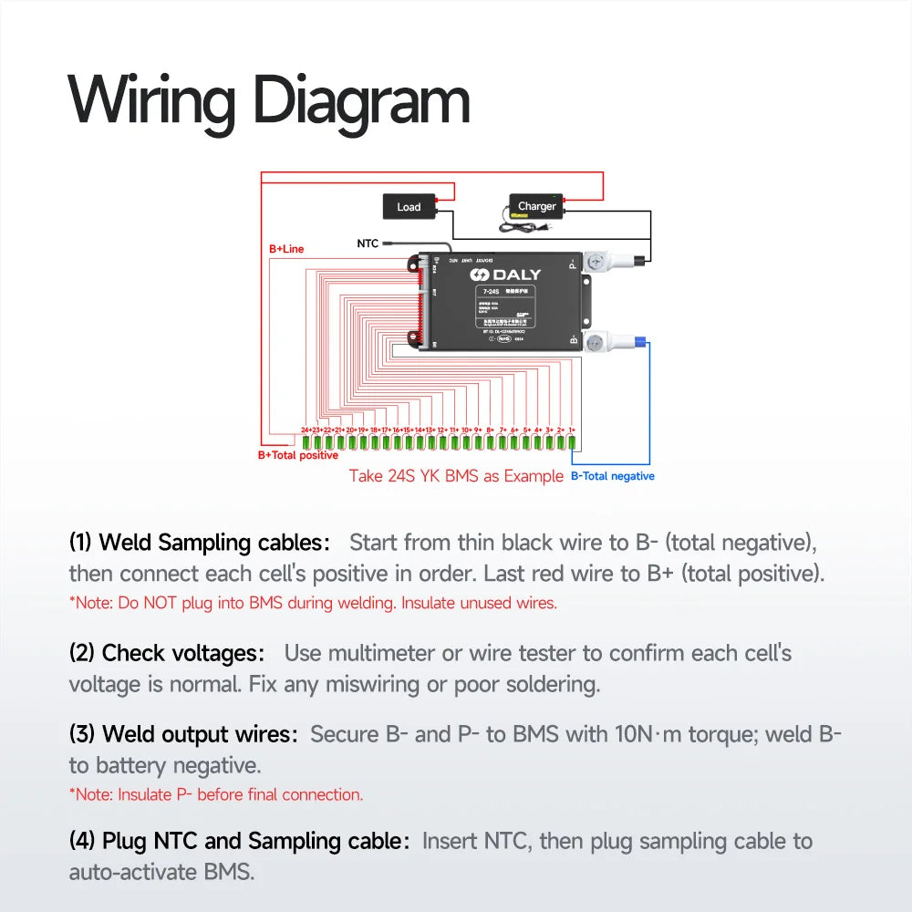 (1)Weld Sampling cables: Start from thin black wire to B- (total negative),then connect each cell's positive in order. Last red wire to B+ (total positive) |